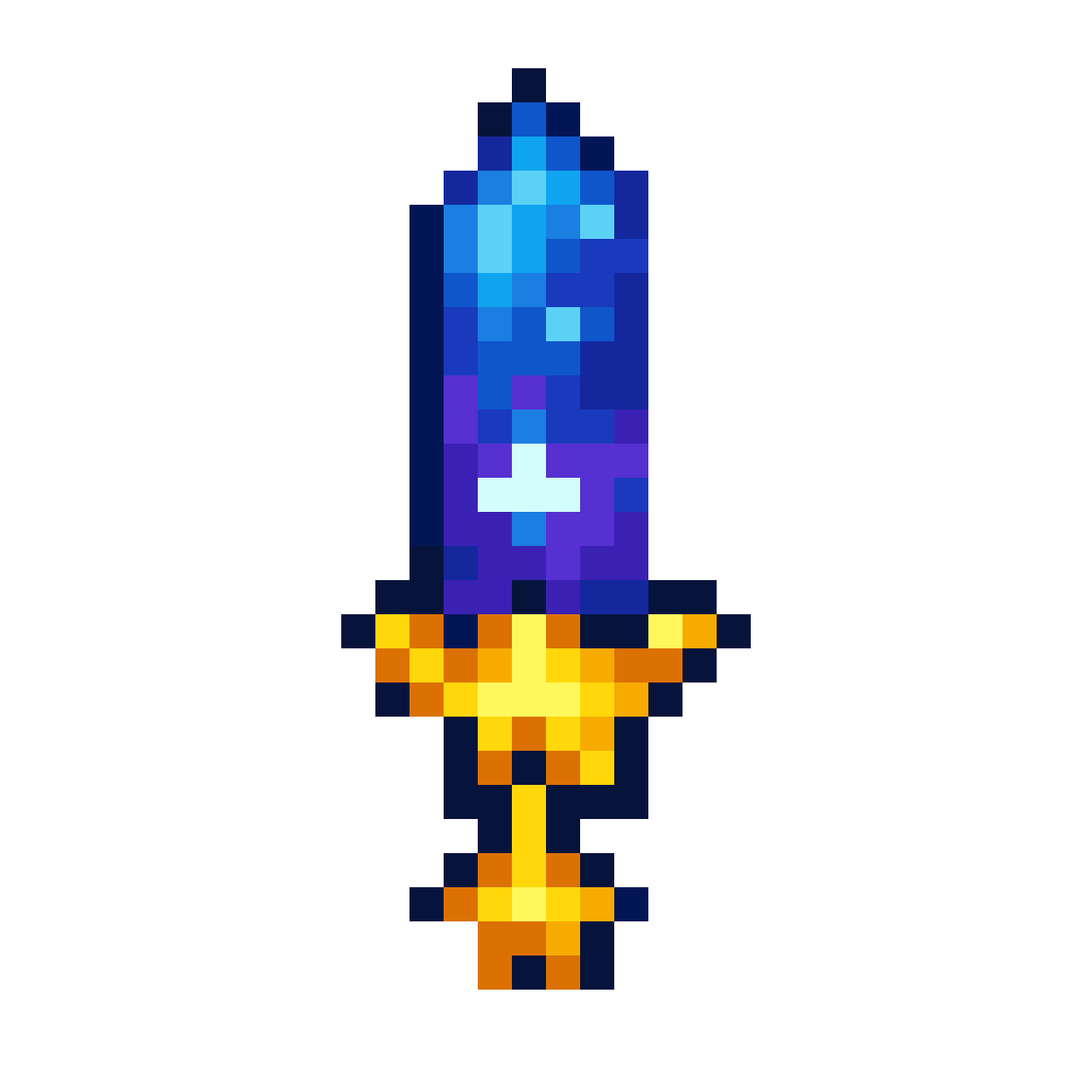 Pixel art sword, Terraria-like style, 32x32 pixels, top-down. Simple readable design. Blade with cosmic colors (blue, pu...