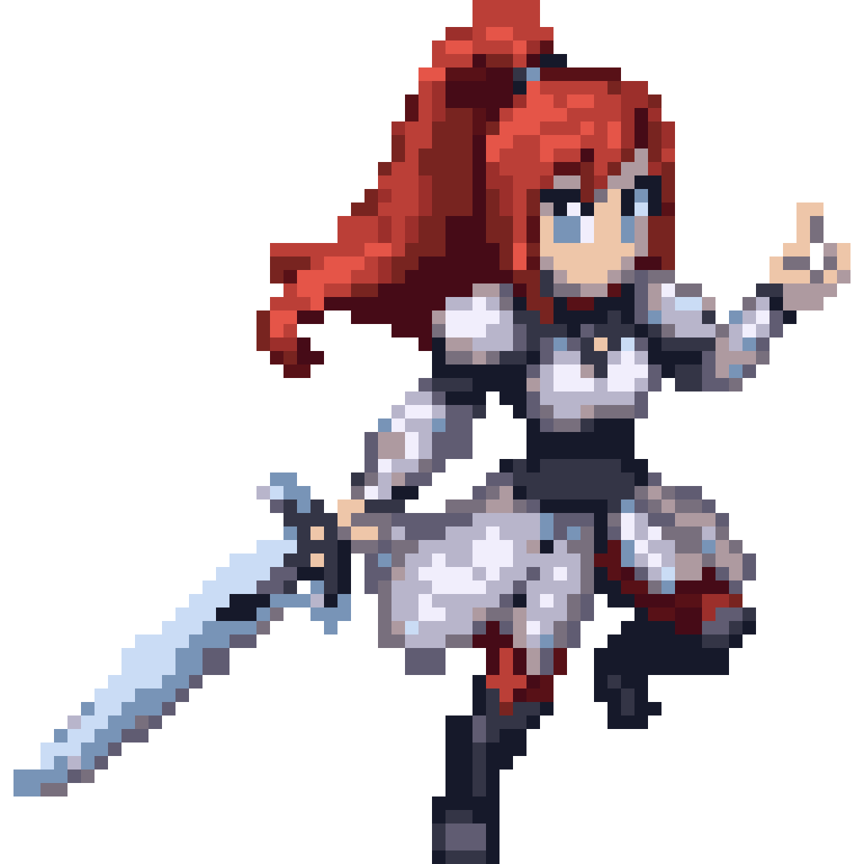 Heroine with red hair and white armour, carrying a sword, side view, fantasy RPG style, 16x16, pixel perfect