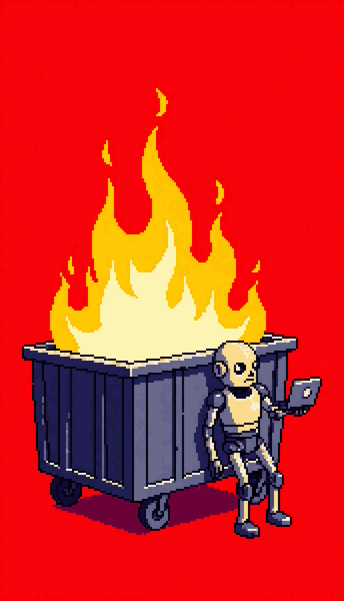Generate an image of a dumpster on fire with a robot character in front of it with two arms, two legs, and holding a lap...