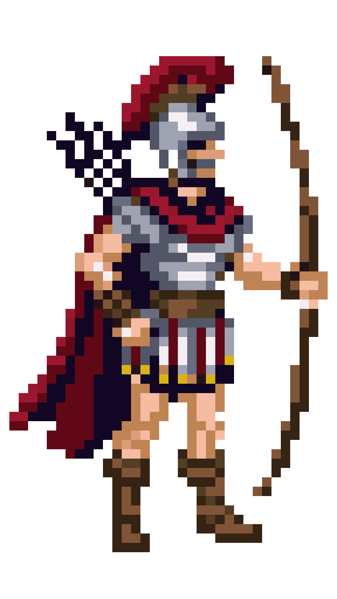 roman soldier holds a long bow and has some arrows on his arrow rest in the back