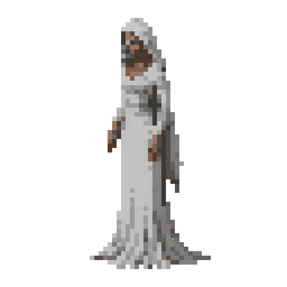 A tall woman in a wedding dress with a veil over her head that hides her face. Her sleeves are long and stretch slightly...