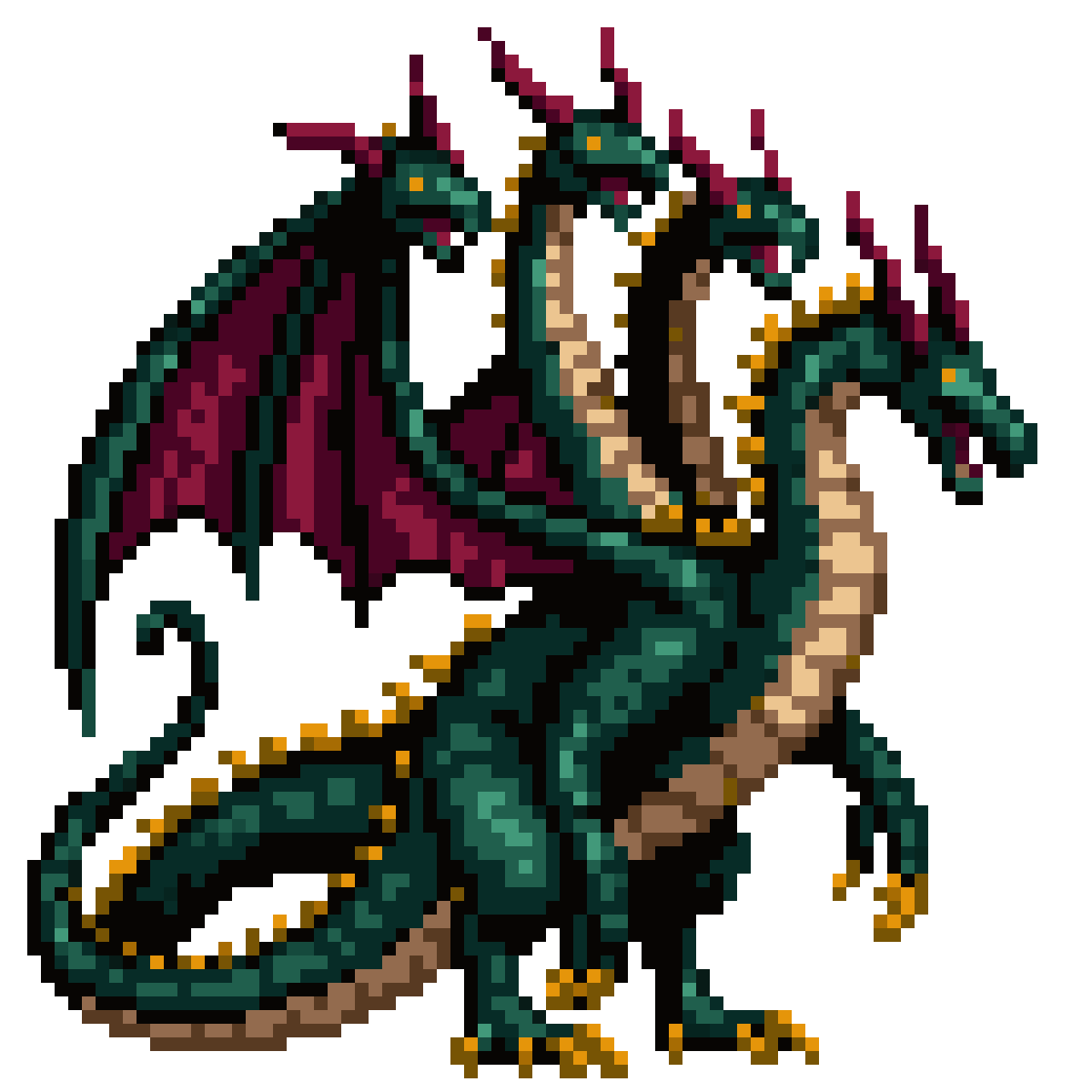 Massive ancient seven-headed Turkic dragon boss, large dark green scaled serpentine body with seven long thick necks eme...