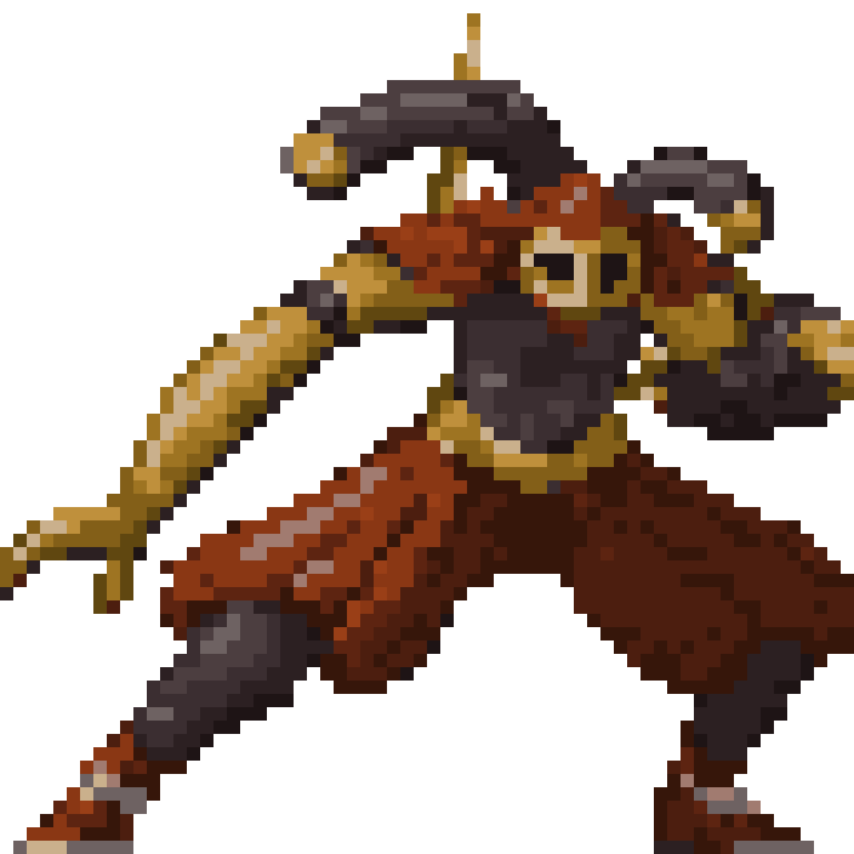붉은 옷의 닌자 노란 목도리 팔을 내리고 서있는 모습, 측면