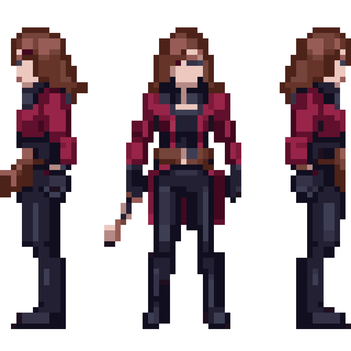 [sprite sheet] of a female rogue character. character design details: she must retain the outofit: dark red jacket with ...