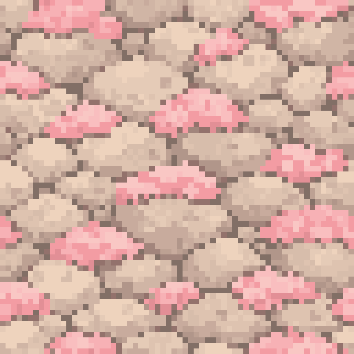 seamless stylized rock and grass texture, soft rounded stone with patches of sakura grass on top edges, warm gray and be...