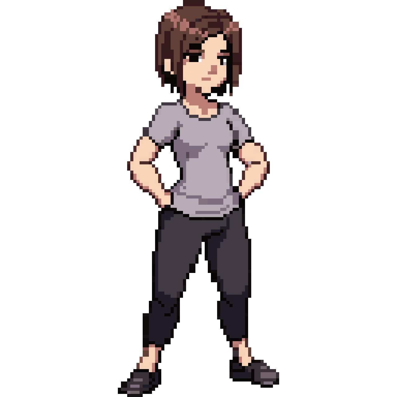 A stylized 2D RPG character with an athletic, well-proportioned body, standing in a confident neutral pose, facing sligh...