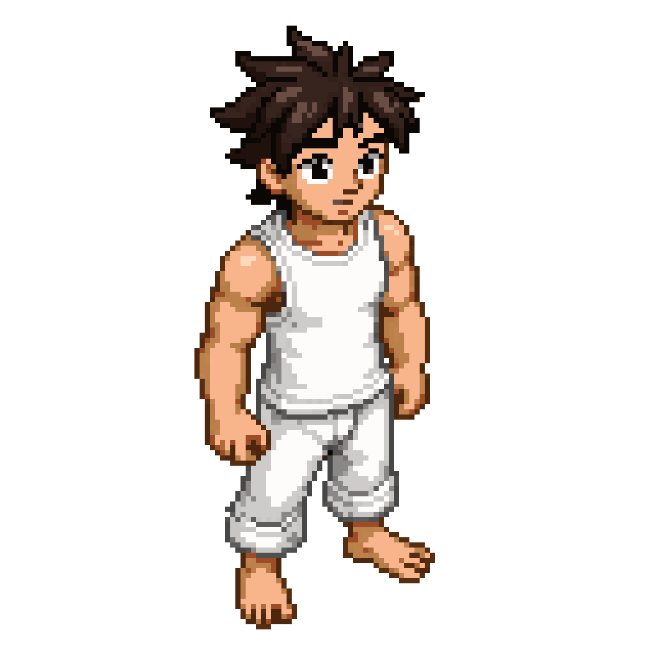 The character is a young adult male with a slightly stylized, semi-cartoonish muscular build. He has messy dark brown sp...