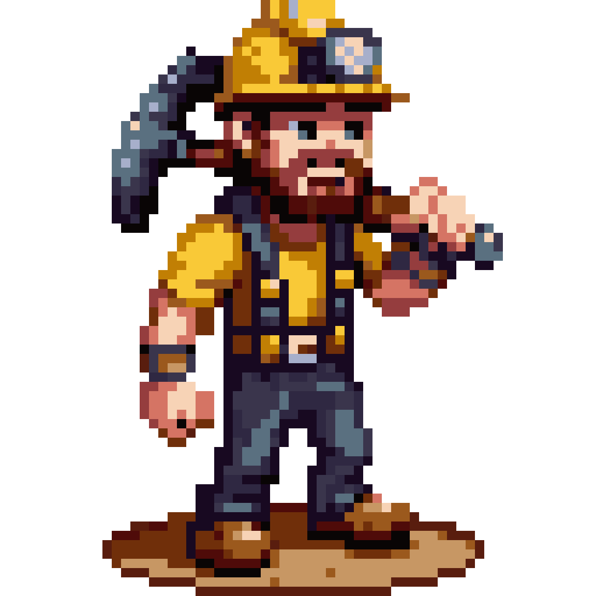 isometric pixel art survivor miner, work overalls with suspenders, hard hat with lamp, pickaxe over shoulder, dirt on fa...