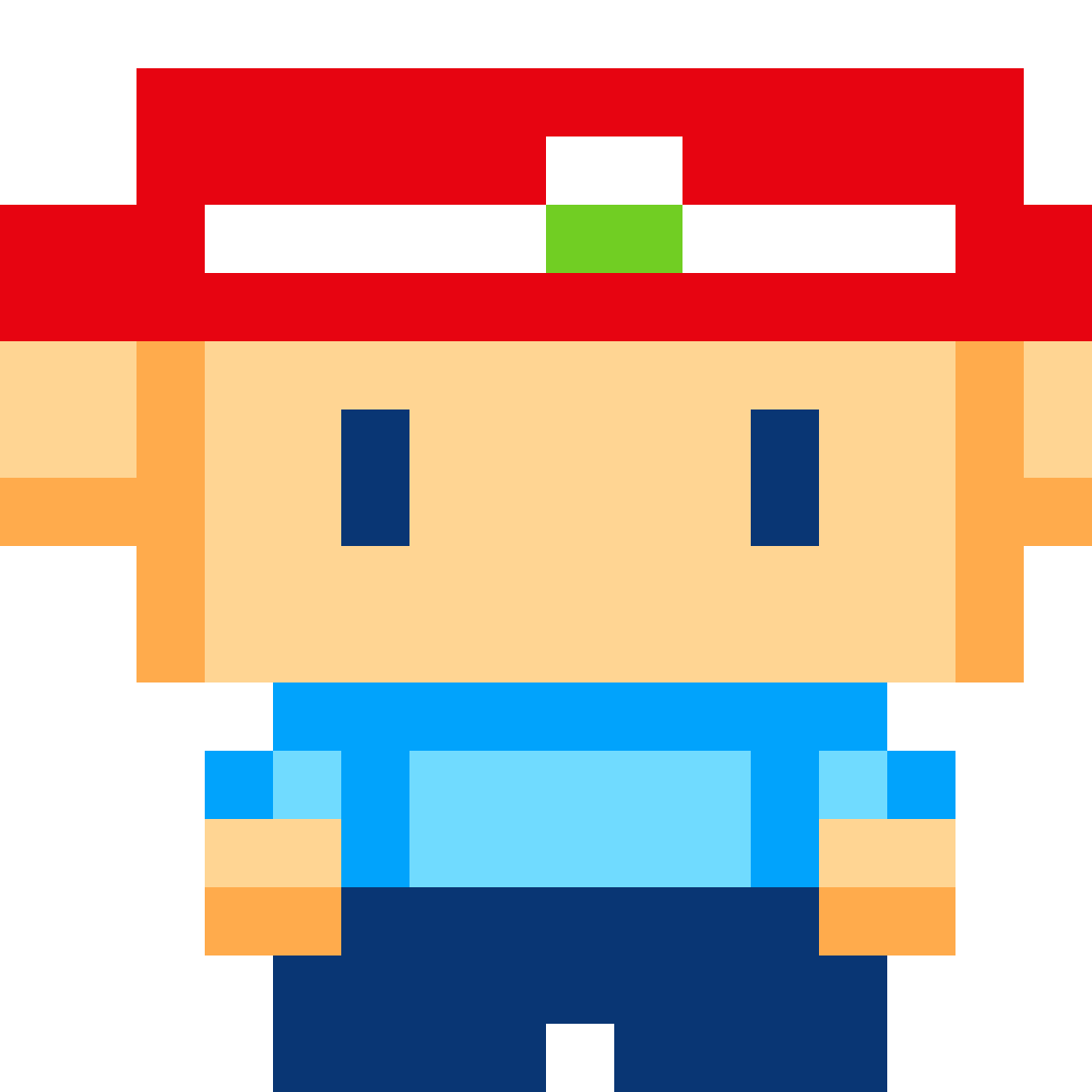 pixel art character, simple symmetrical design, large square head with light skin tone (beige/orange), minimal face with...