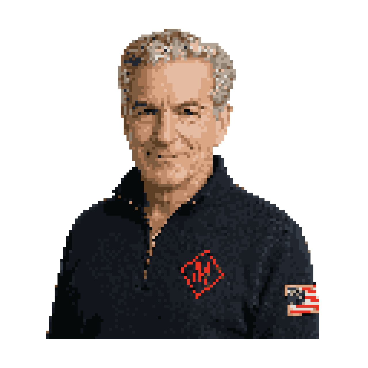 The man has thick, swept-back silver-gray hair and dark eyebrows. His eyes are light-colored with visible crow’s feet. H...