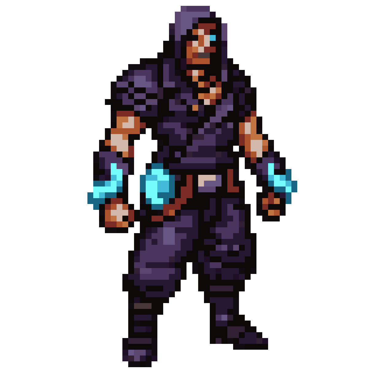 pixel art character sprite, base idle stance. A gritty, vengeance-driven street brawler in a Neo-Noir Alchemical Cyberpu...