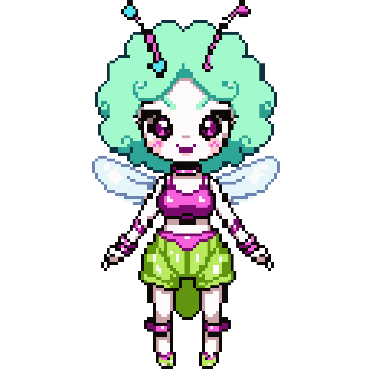 vibrant anime-style insect-humanoid girl set against a pastel pink background. She has voluminous, curly mint-green hair...