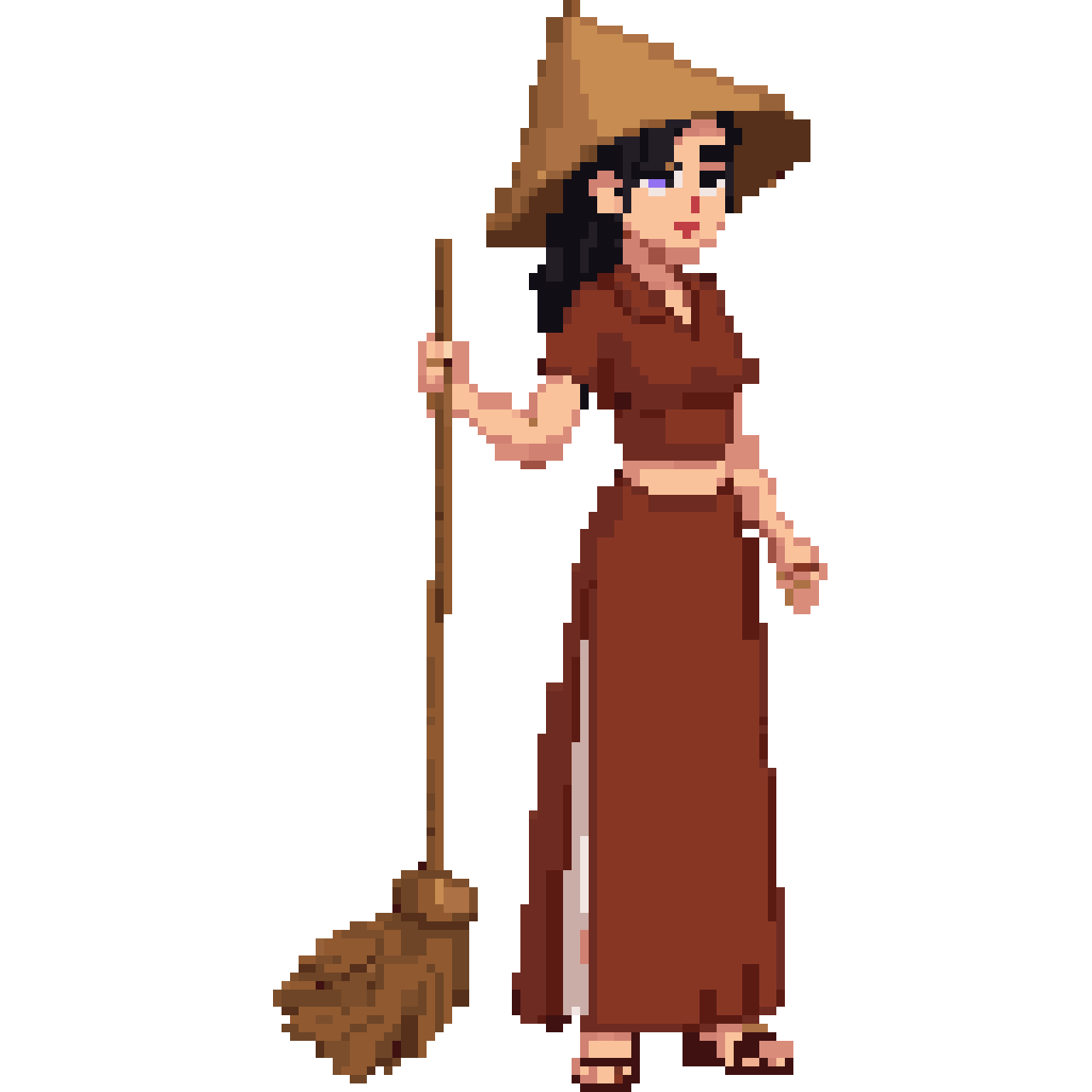 phụ nữ mặc áo bà ba nâu việt nam. cấm 1 cây chổi. đôi nón lá. nhìn từ bên cạnh. phong cách art