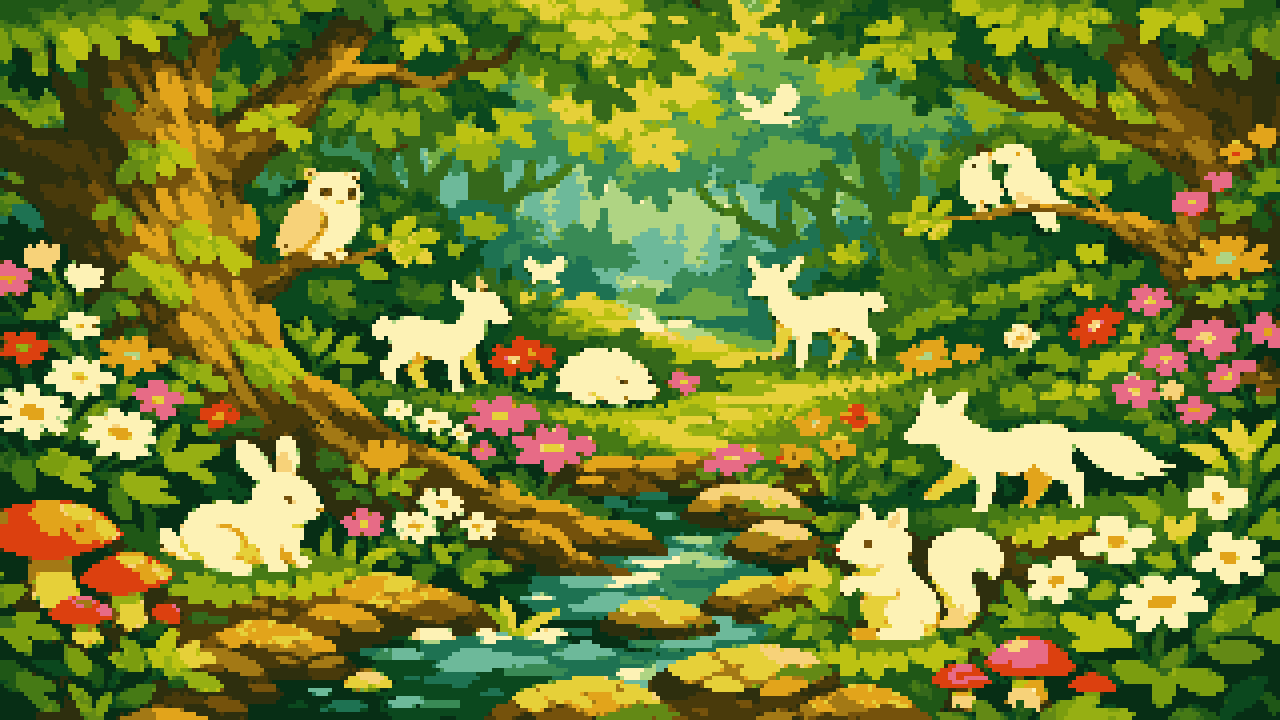 Create a side-scroller style oaky forest background. I want it to be whimsical with lots of foliage and bright colors. ...