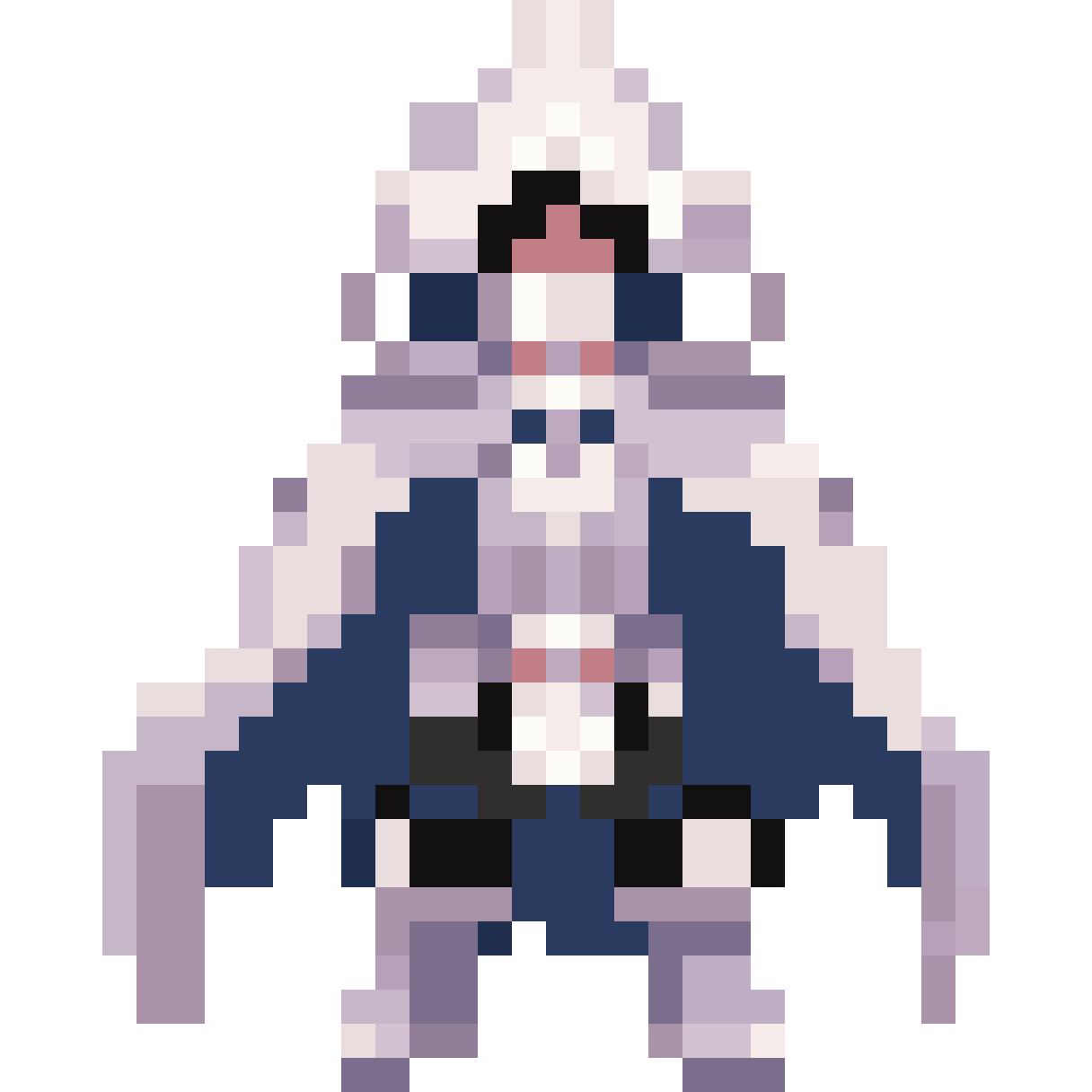 pixel art sprite of a female assassin wearing a flowing white shroud and hood, white fabric cover over her nose and mout...