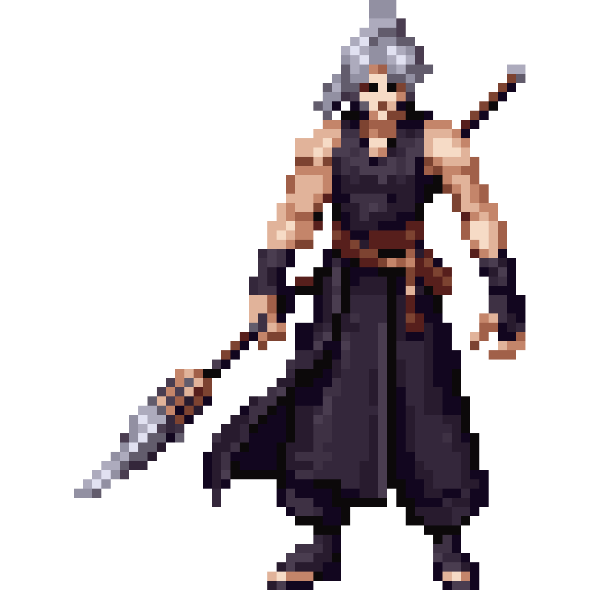 Pixel art, handsome young male wuxia hero, silver hair, red eyes, black sleeveless robe over dark inner shirt, wide br...