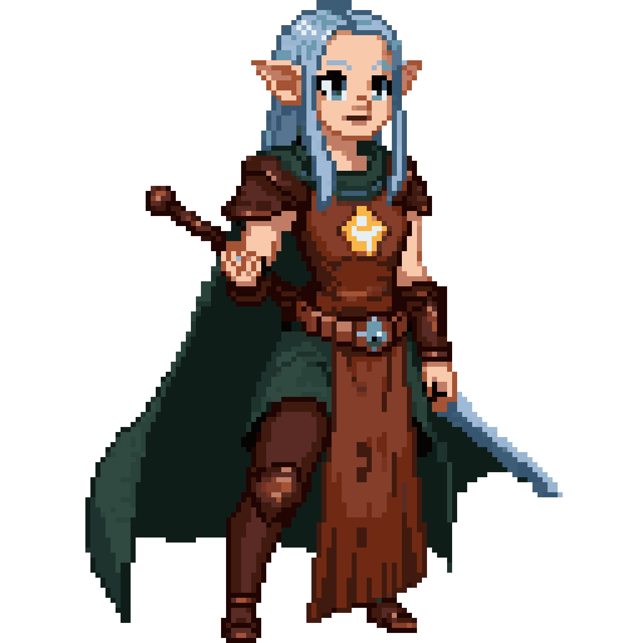 Lyra, a young elven woman, designed for a top-down RPG game. Lyra has long silver hair with subtle turquoise tips, cre...